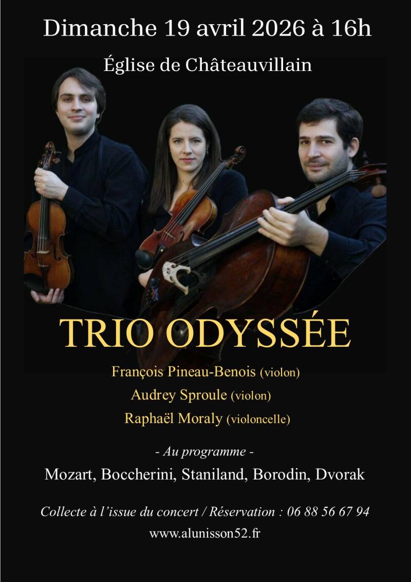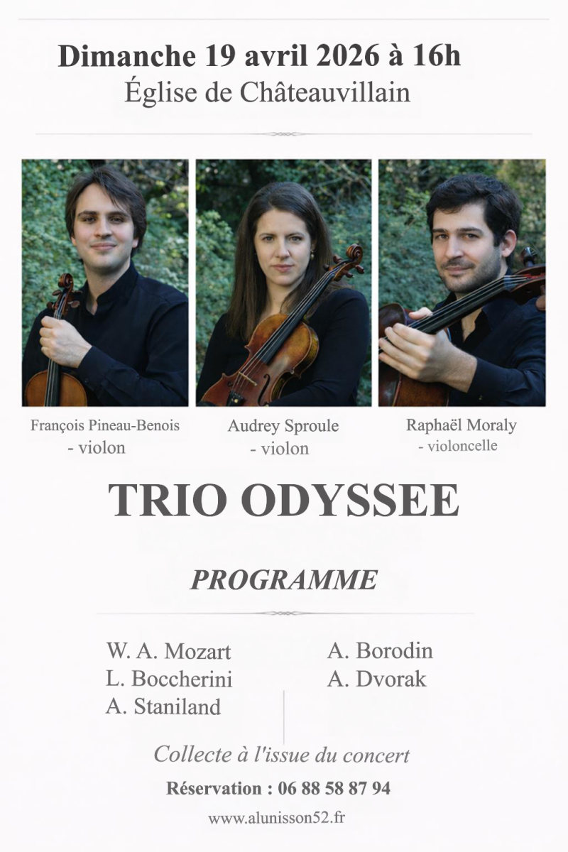 Le quatuor Odyssée a donné l’an passé un magnifique concert à Créancey ! Ils reviennent en trio cette année … Trio Odyssée (composé des musiciens du Quatuor Odyssée)